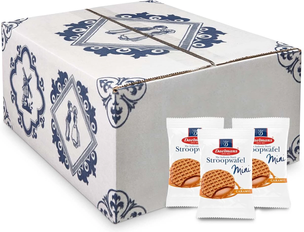 Bezorg je gasten een glimlach op hun gezicht met een klein gebaar, wel 200 keer! Deze doos is namelijk gevuld met maar liefst 200 heerlijke mini Stroopwafels van Daelmans. Stroopwafeltjes gevuld met een zachte roomboter stroopvulling verrijkt met natuurlijk Bourbon vanille. De Stroopwafeltjes hebben een diameter van 4,5 cm en zijn individueel verpakt. Dit maakt ze zeer geschikt voor horecagelegenheden, op kantoor of gewoon lekker thuis bij een kopje koffie of thee.