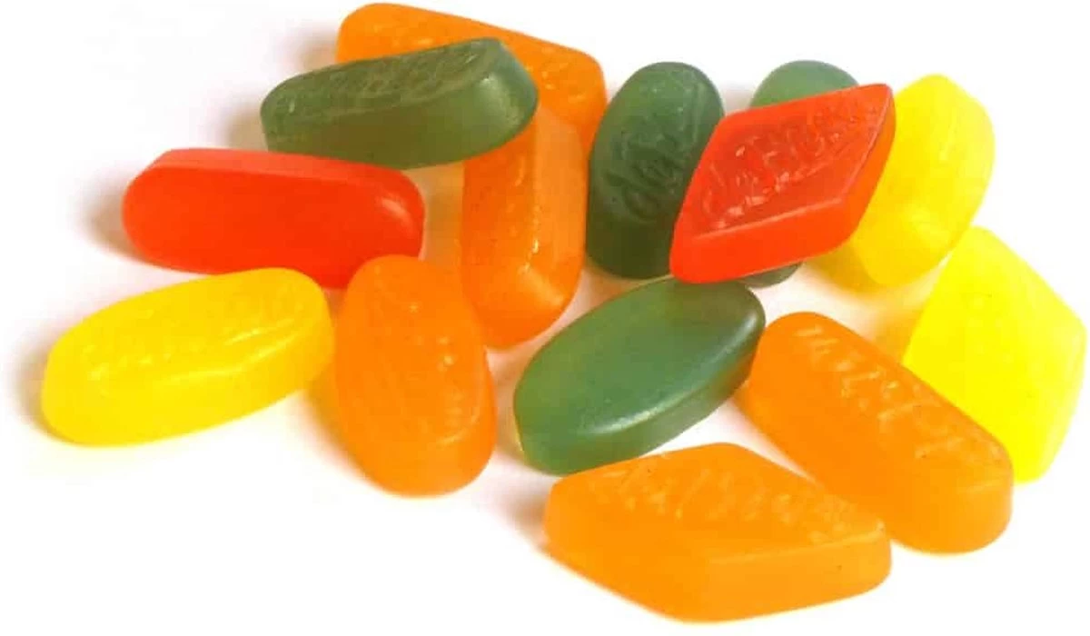 | Ingrediënten | zoetstof: maltitol, gemodificeerd zetmeel, voedingszuur: E270, E330, aroma(s), kleurstoffen: E100, E120, E141, plantaardige olie: palm, glansmiddel: bijenwas |