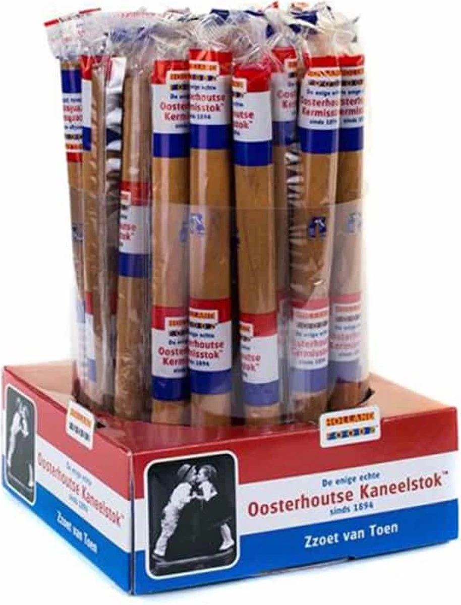 De echte Oosterhoutse Kermis Kaneelstok. Productinformatie: plm 20 cm lang x 1,9 cm doorsnede. gewicht gemiddeld 45 gram per stuk