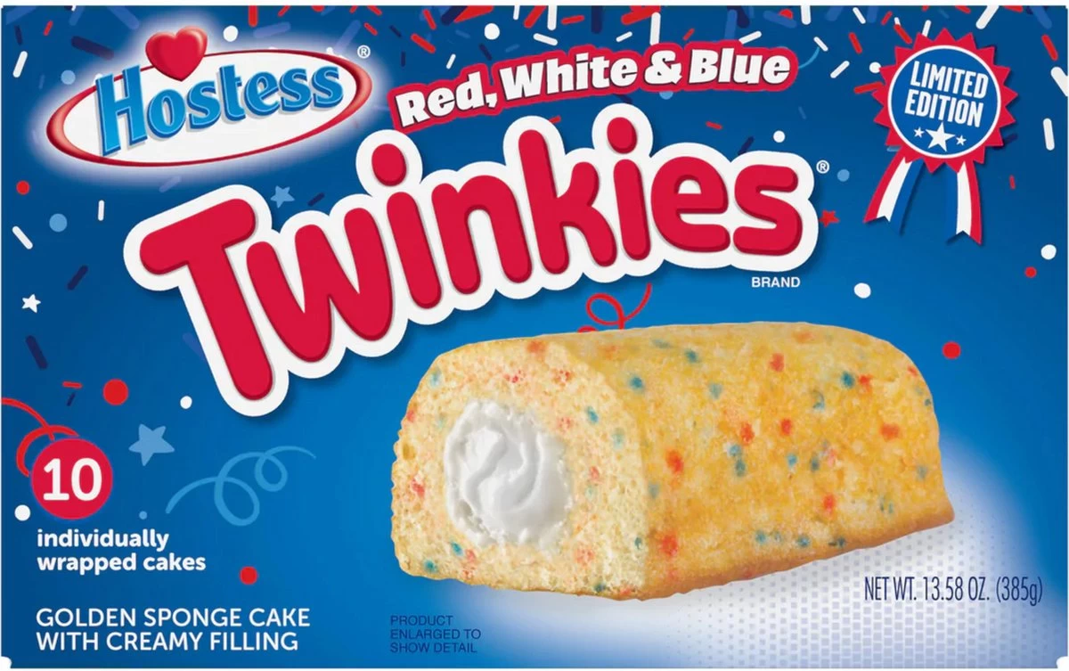 De heerlijke Twinkies van Hostess zijn de perfecte snacks voor tussendoor of thuis. De cakejes gemaakt volgens de kleuren van de Amerikaanse vlag. Een echte Amerikaanse lekkernij. De cakes zijn gevuld met crème en zijn besprinkeld met rode en blauwe sprinkels.