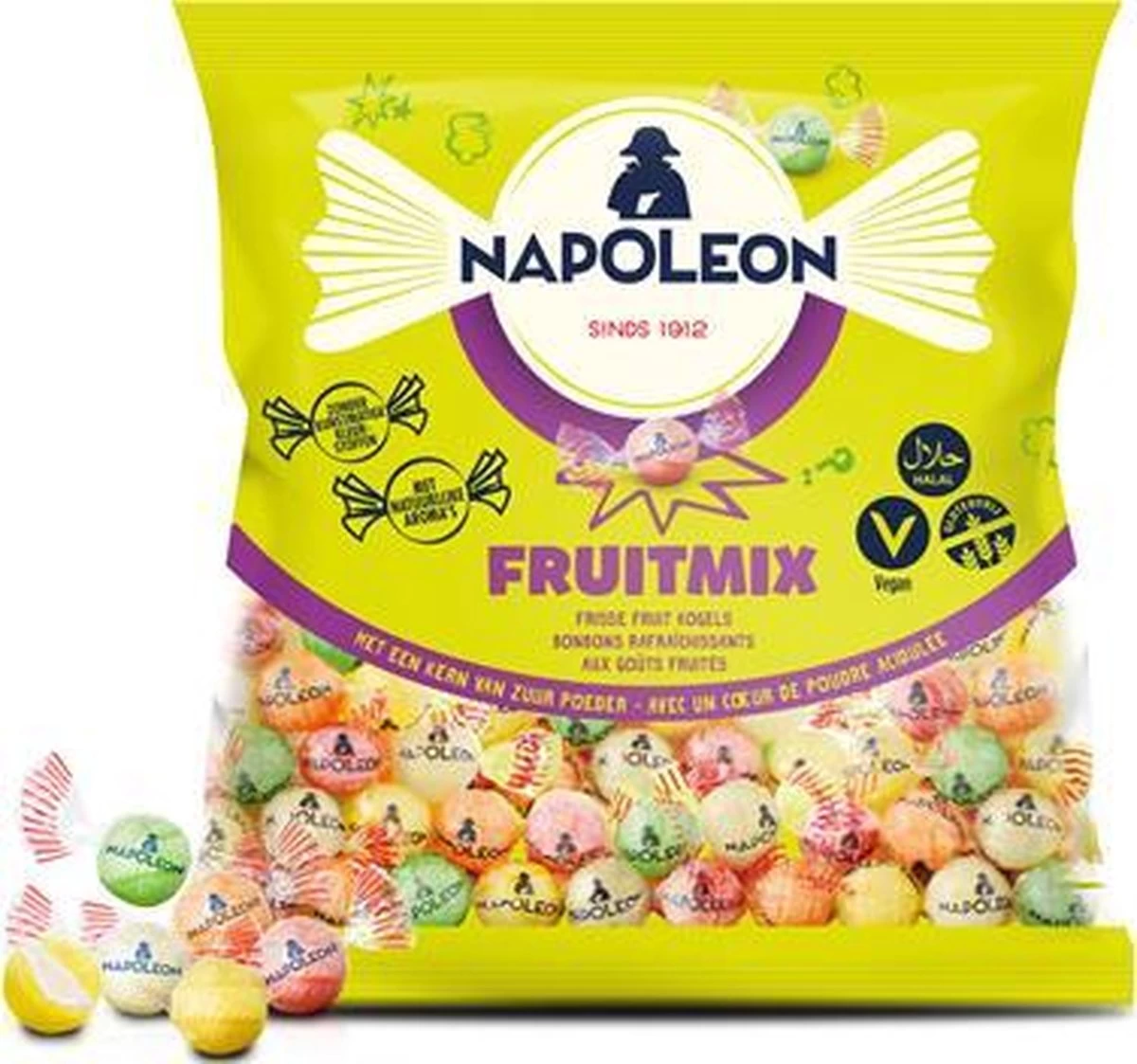 Heerlijke mix Fruitkogels van Napoleon. Productinformatie:plm 2 cm doorsnede (zonder verpakking)gewicht gemiddeld 7 gram per stuk