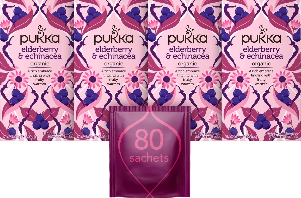 Een fruitige omhelzing met echinacea wortel, blad en vlierbloesem voor een warm gevoel. Bevat echinacea, wat traditioneel geconsumeerd wordt voor een gebalanceerde ondersteuning van jouw immuunsysteem.* Wij streven ernaar positieve verandering te brengen op de wereld – voor jou, de natuur en alles daar tussenin. Pukka Elderberry & Echinacea is een blend met echinacea wortel, blad en vlierbloesem. Gemaakt van 100% biologische ingrediënten die duurzaam verbouwd zijn. Bovendien zijn we trots om aangesloten te zijn bij 1% for the Planet en is dit product Fair for Life en FairWild gecertificeerd. Breng deze heerlijke kruiden tot leven door ze tot 15 minuten in vers gekookt water te laten trekken. Een doosje bevat 20 individueel verpakte theezakjes die volledig biologisch afbreekbaar zijn. *Geniet van deze infusies als onderdeel van een gezonde voeding en levensstijl. In afwachting van toelating door de Europese Commissie.