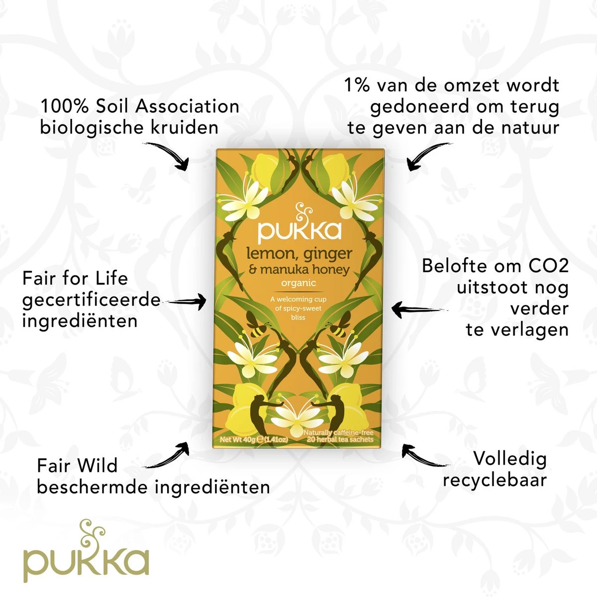 Pukka Lemon Ginger & Manuka Honey is een blend met gemberwortel, citroen en manuka honing aroma.