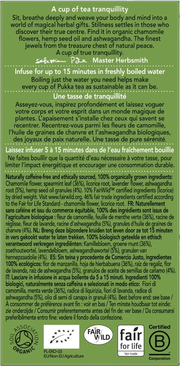 - Samengesteld met kalmerende kamille, verfrissend groene munt blad, zoethoutwortel, lavendel, hennep en adaptogeen kruid, ashwagandha.