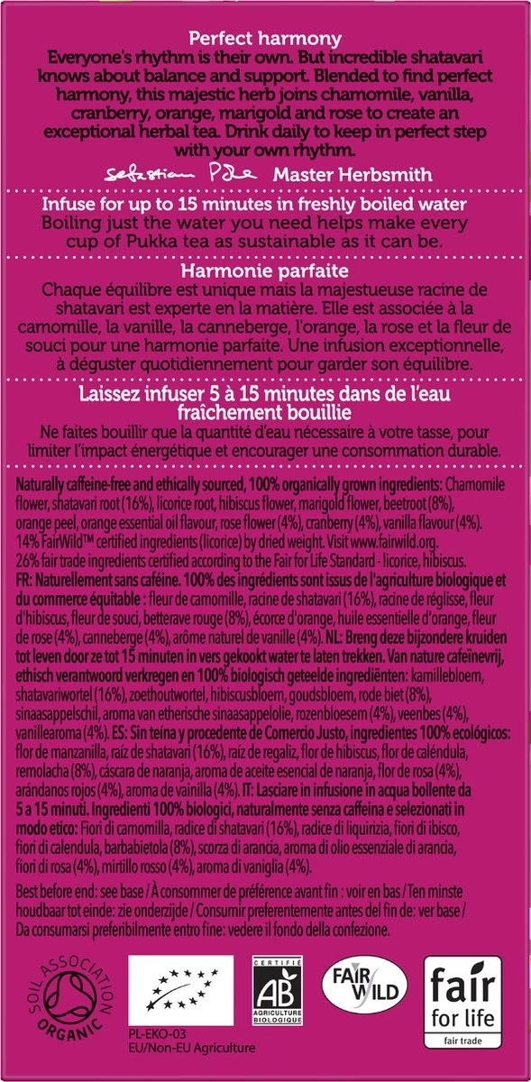 Balance is a gift for mind and body. She is one of India’s most regal roots so let shatavari weave you her hammock of respite. Chamomile to caress and sweet licorice and vanilla to soothe your every sense. Then cranberry, orange, marigold and rose brings all your colour back to life. A cup of perfect balance to restore body and soul.