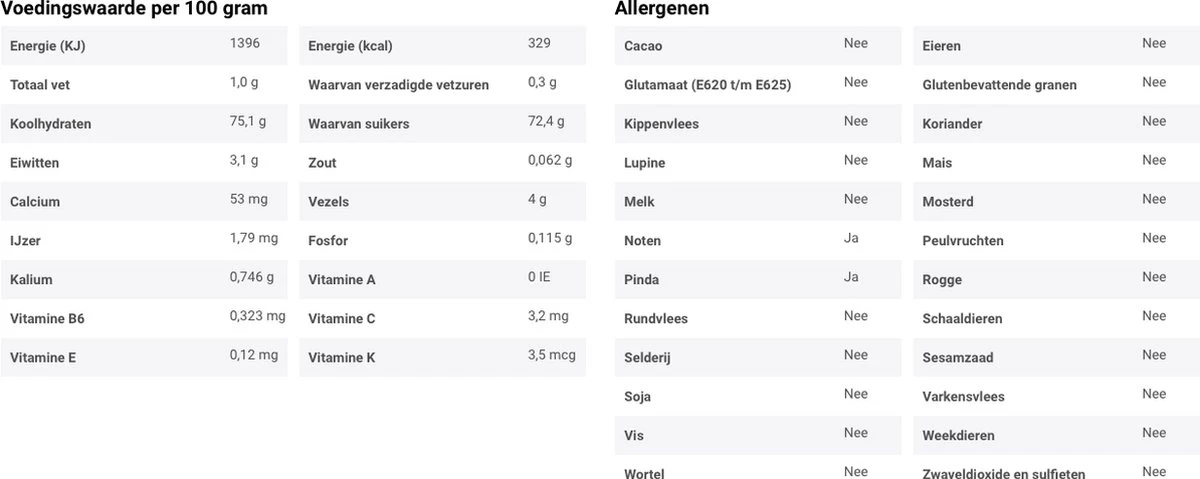 | Allergeneninformatie | Dit product wordt verpakt en/of bewaard in een bedrijf waar ook producten met noten, pinda, mosterd, selderij, gluten, sesam, soja en sulfiet worden verwerkt. Ondanks alle voorzorgen is het mogelijk dat dit product sporen van deze allergenen bevat. |