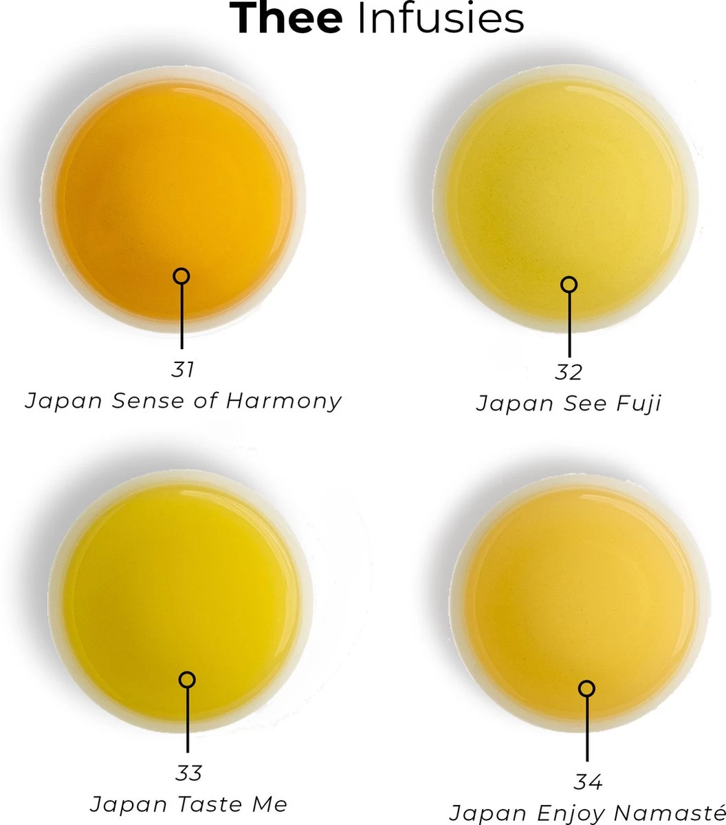 De andere theeën komen ook uit Japan. De kruiden zijn afkomstig uit diverse andere landen.
