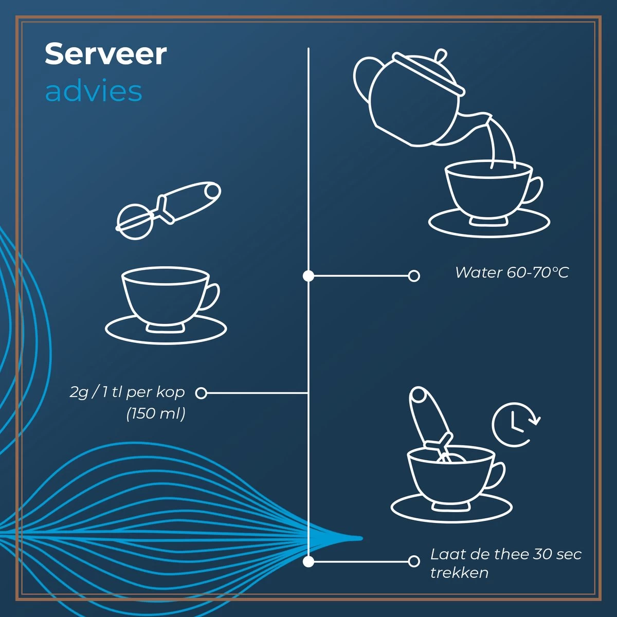 Deze bijzondere thee is gevoelig voor temperatuur. Ongeveer 60-70 graden water haalt de beste en meest unieke smaak uit deze thee.