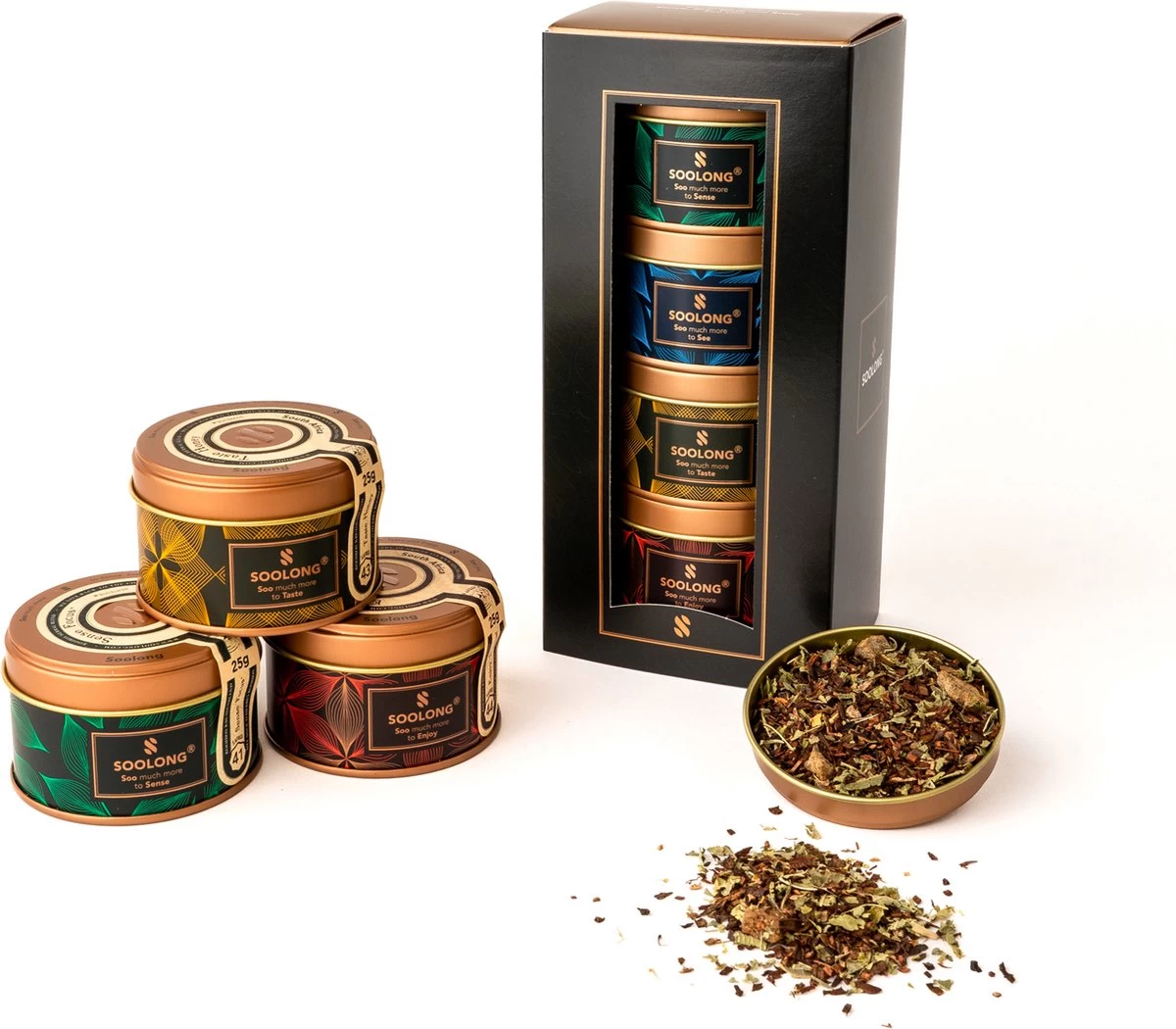 Een warm geschenk van losse rooibos & honeybush blends in prachtige blikken.