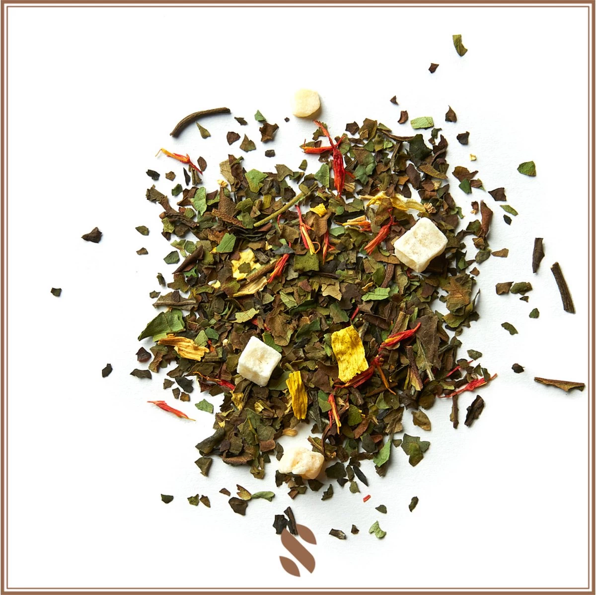 Look & Feel: zomers mix van groen (witte thee), geel (zonnebloemblaadjes) en rood (saffloer bloemen) blad