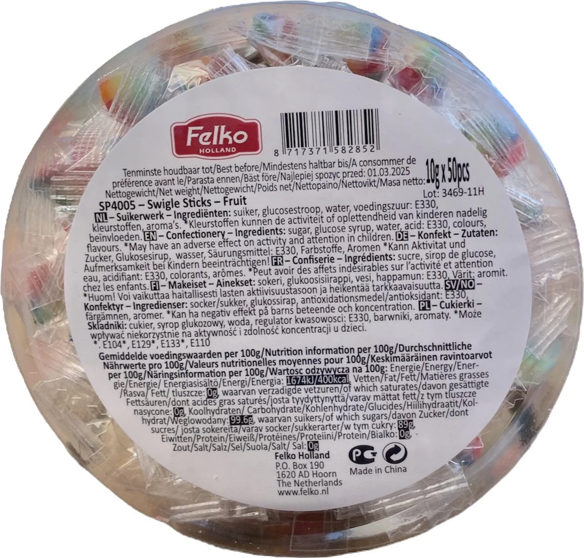 | Ingrediënten | suiker, glucosestroop, water, voedingszuur (E330), kleurstoffen (E104, E129, E133, E110), aroma's. |