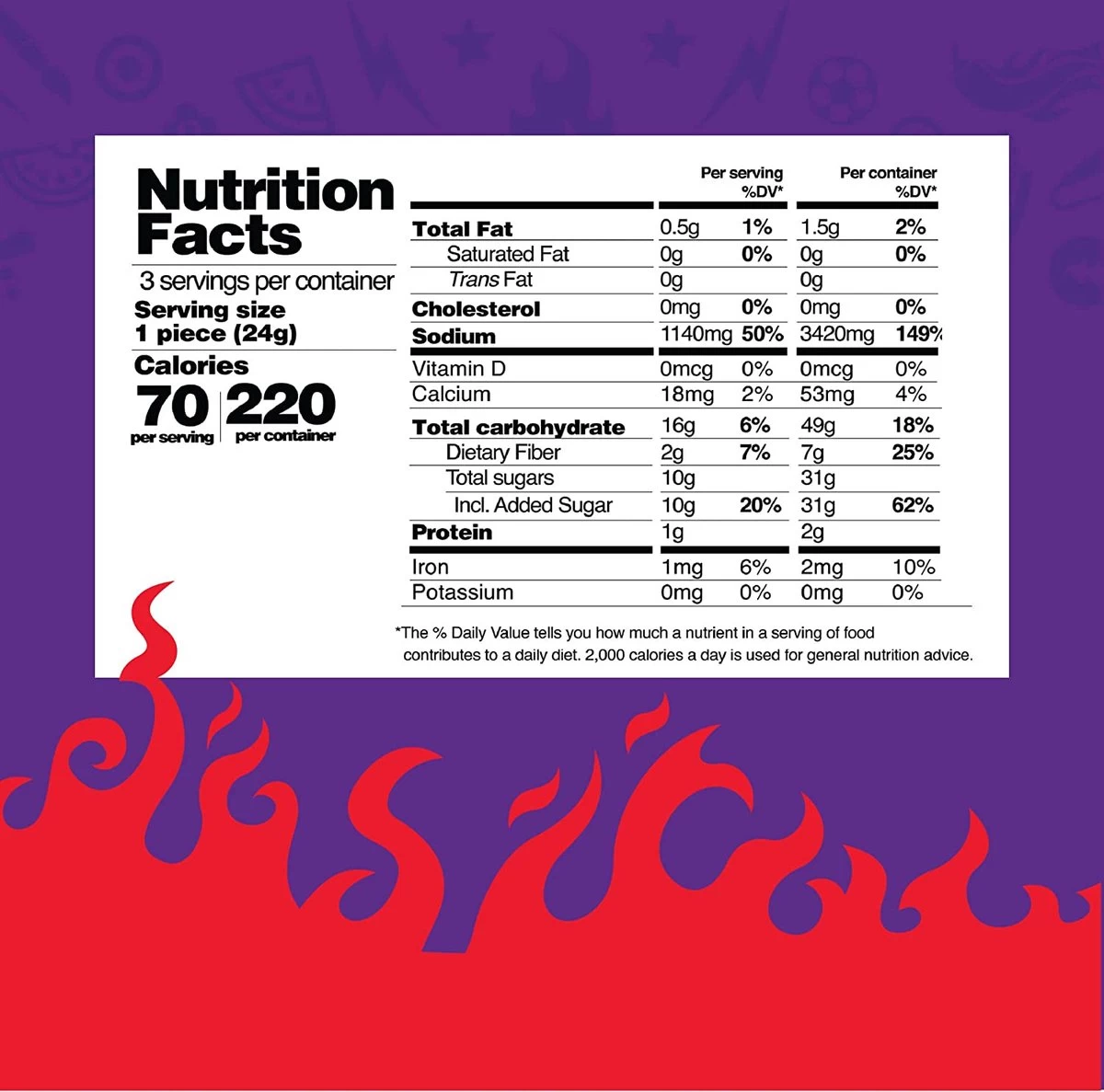 | Ingrediënten | Toegevoegde suikers (suiker, maïssiroop), chilipoeder (chilipeper, jodiumhoudend zout, zuurteregelaar (E330), natuurlijke aroma's, toegevoegde suiker, (maïssiroop vaste stoffen), kleurstoffen (E160c, E129*, E321, E319, E171), zuurteregelaar (E330), emulgator (E322). *Kan nadelige effecten hebben op de activiteit en aandacht bij kinderen. |