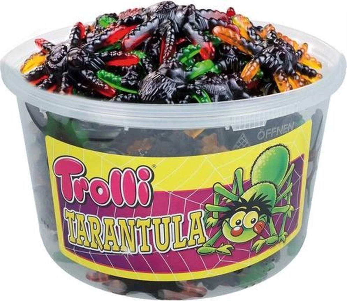 Met zijn fruitige smaak en grote glanzende Glibber-lijf, jaagt de Trolli Tarantula op Trolli-liefhebbers. Als je deze spinnen op het net zet, is extra groot plezier onvermijdelijk. De angstaanjagend heerlijke en ongeveer 6 x 6 cm grote achtpotige spinnen overtuigen met hun gedetailleerde uiterlijk. Fruitsmaak van frambozen, bramen, appel, aardbei en sinaasappel.